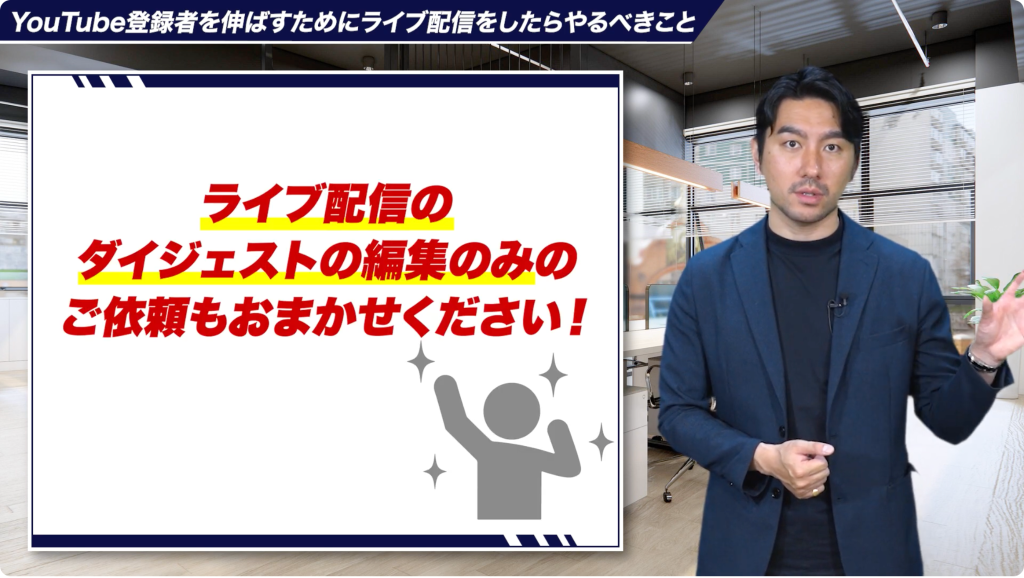 もし「ライブ配信をしても伸び悩んでいる」「編集に時間が取れない」という方は、専門の動画編集代行を活用し、1本の配信を長期的にチャンネル成長へつなげていきましょう。