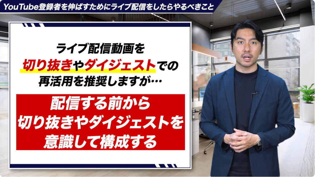 つまり、1回のライブ配信を複数の動画コンテンツに再利用できるという点で、時間対効果が非常に高い戦略となります。