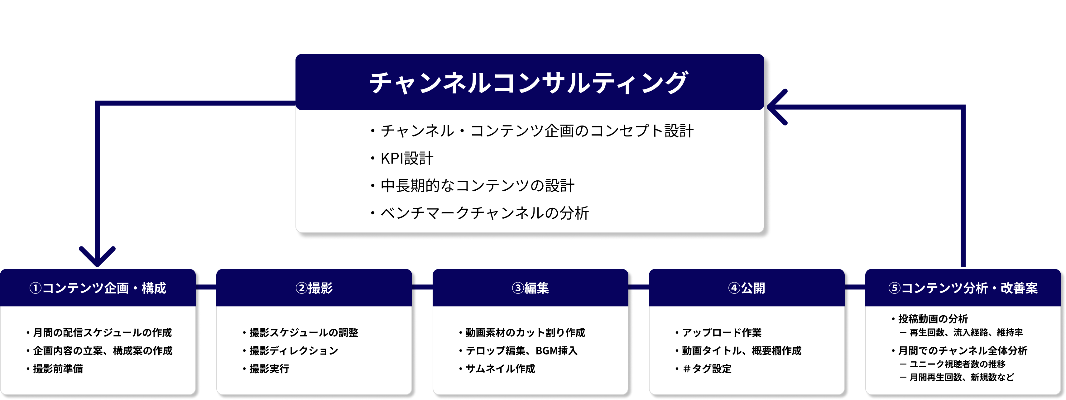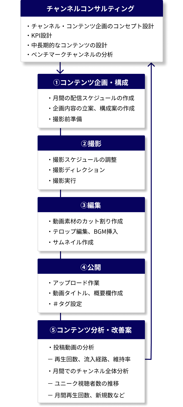 コンセプトや目標設計、必要な動画企画から撮影、編集、公開、分析から改善提案まで